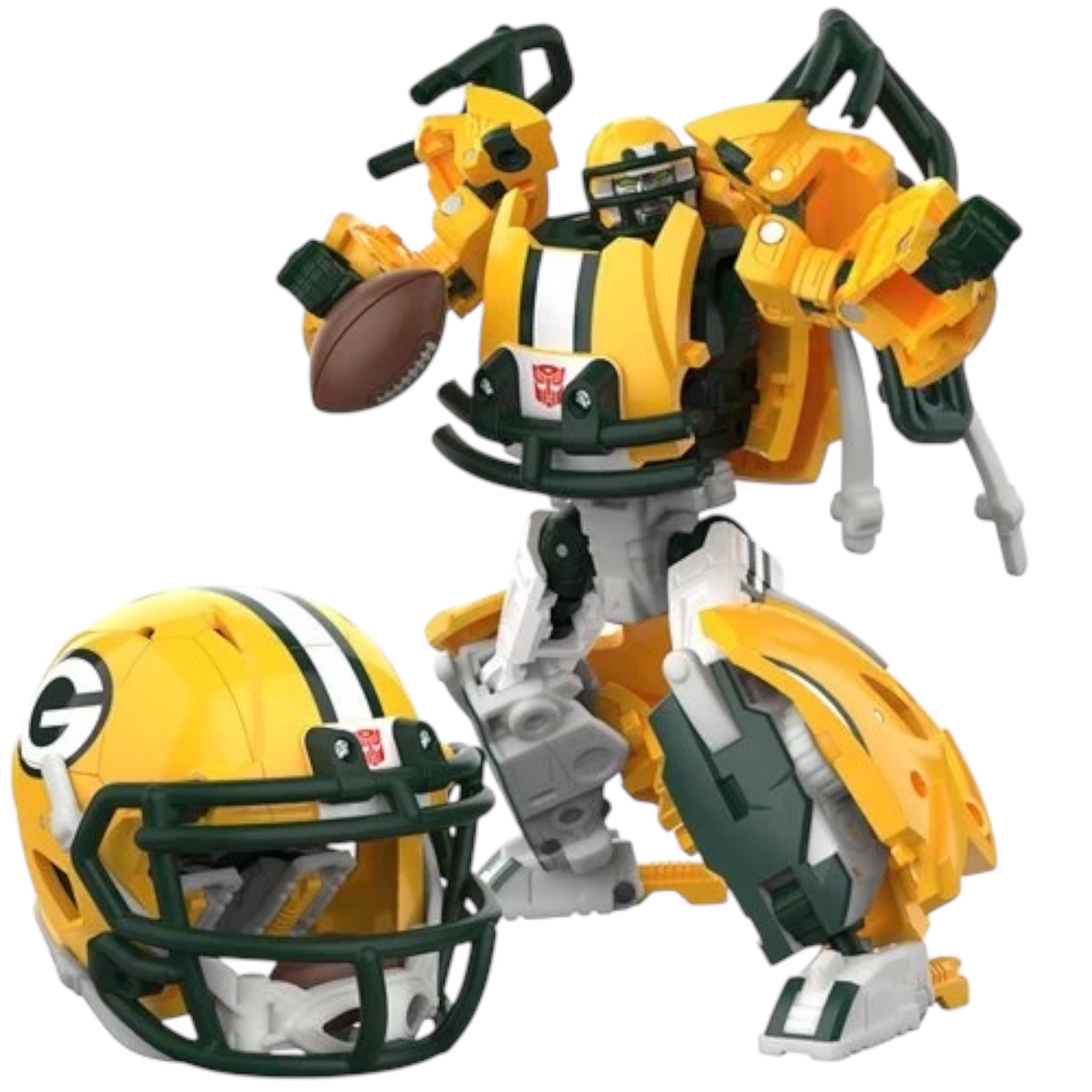 Experience the epic combo of Transformers robots and the NFL with the Transformers Green Bay Packers Tundra Prime toy! The 5.5-inch (14 cm) figure converts from robot action figure to football helmet mode in 23 steps. With intricate pose ability and accessories like a mini football the figure can hold and a mini helmet that the robot figure can wear, this unique collaborative action figure makes an awesome addition to any Transformers or NFL collection. Look for more Transformers collectible toys (sold separately, subject to availability) featuring favorite characters like Optimus Prime, Bumblebee, Megatron, and more to create a lineup that is — More Than Meets the Eye. Ages 8 and up.