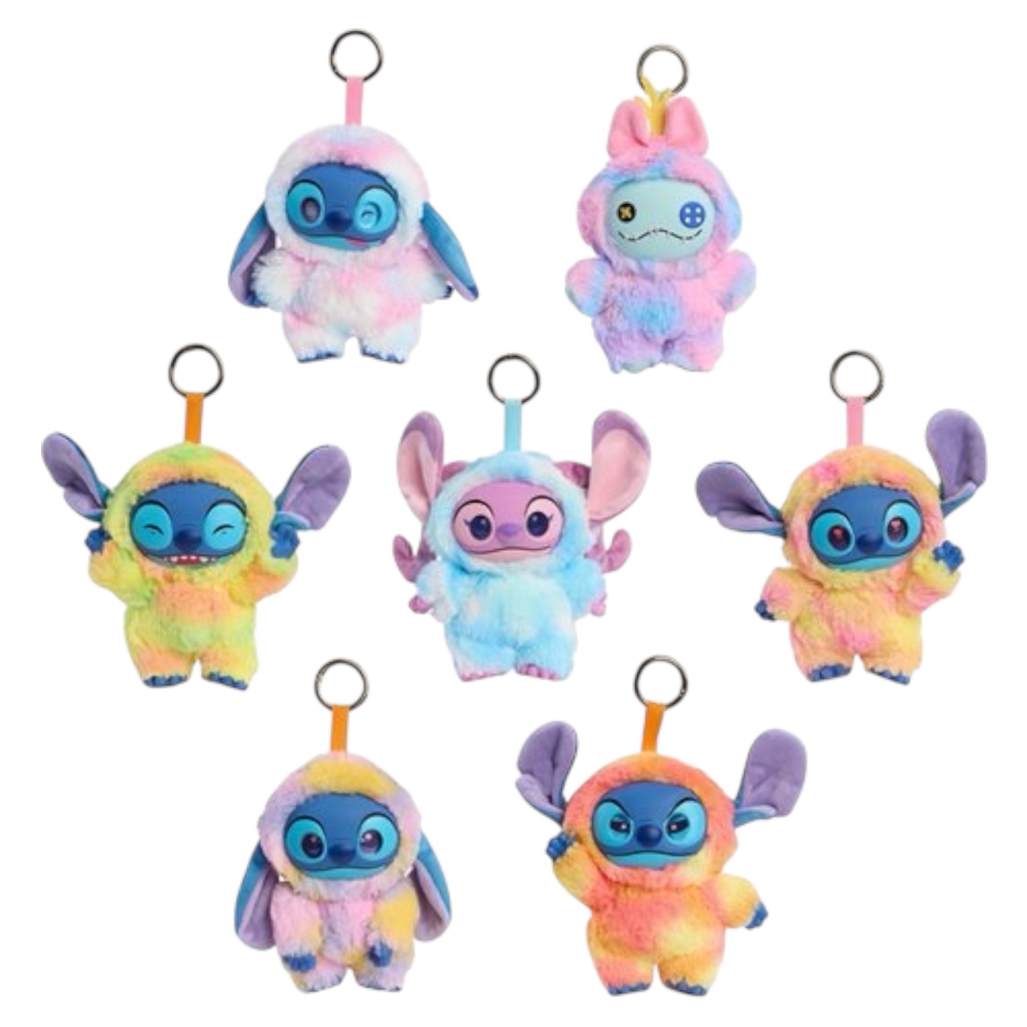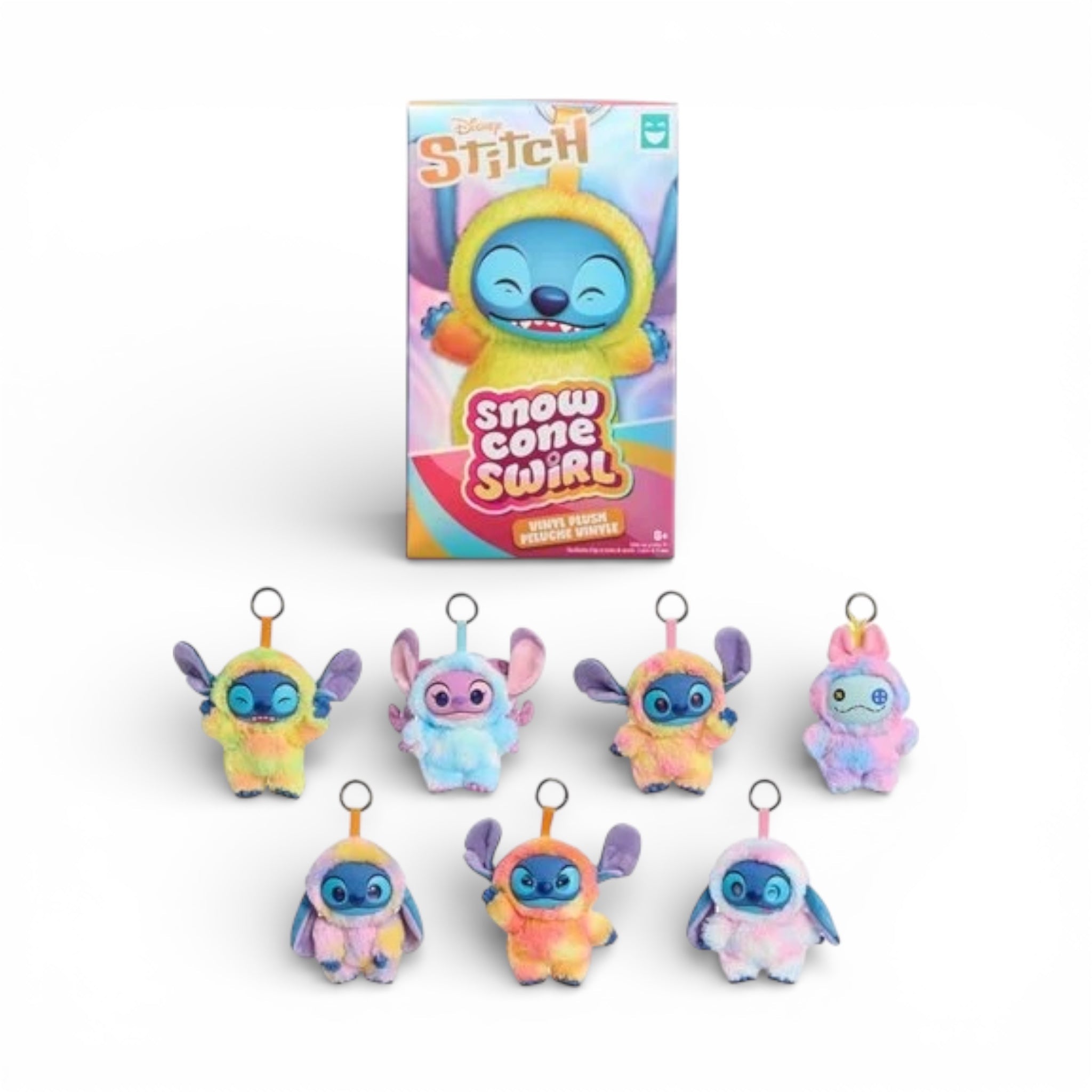 The Happy Haul Disney Stitch Snow Cone Swirl vinyl-face plush collectible accessories add a colorful twist to a favorite alien. Inside each blind box, discover 1 of 7 surprise plush clip-ons featuring a sculpted vinyl face and a soft ombre onesie inspired by the colors of snow cone flavors. Each approximately 5-inch clip-on plush is easy to attach anywhere. Find a fave or haul them all. Disney's Stitch, Angel, Scrump, and the rare multicolored version of Stitch are each sold separately. These short-run drop collectibles bring joy to everyday moments for collectors, fans, and kids. Ages 8 and up.